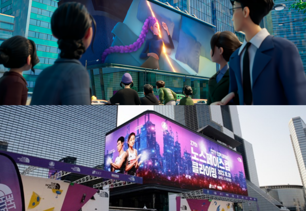 헌트릭스의 신곡 ‘Golden’이 상영된 삼성역 초대형 전광판은 미래적 활기의 서울 중심지로, K-POP 아이돌 뮤직비디오와 생일 광고가 자주 걸리는 팬들의 성지다.