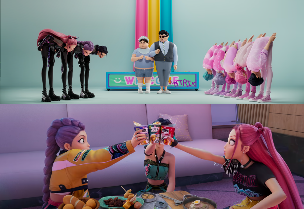 Throughout the animation, everyday aspects of Korean life are seamlessly woven in. Huntrix and the Lion Boys’ 90-degree bow reflects Korea’s unique etiquette, while sitting on the floor to eat with backs resting against the sofa illustrates the country’s floor-seating culture and family-style dining traditions.