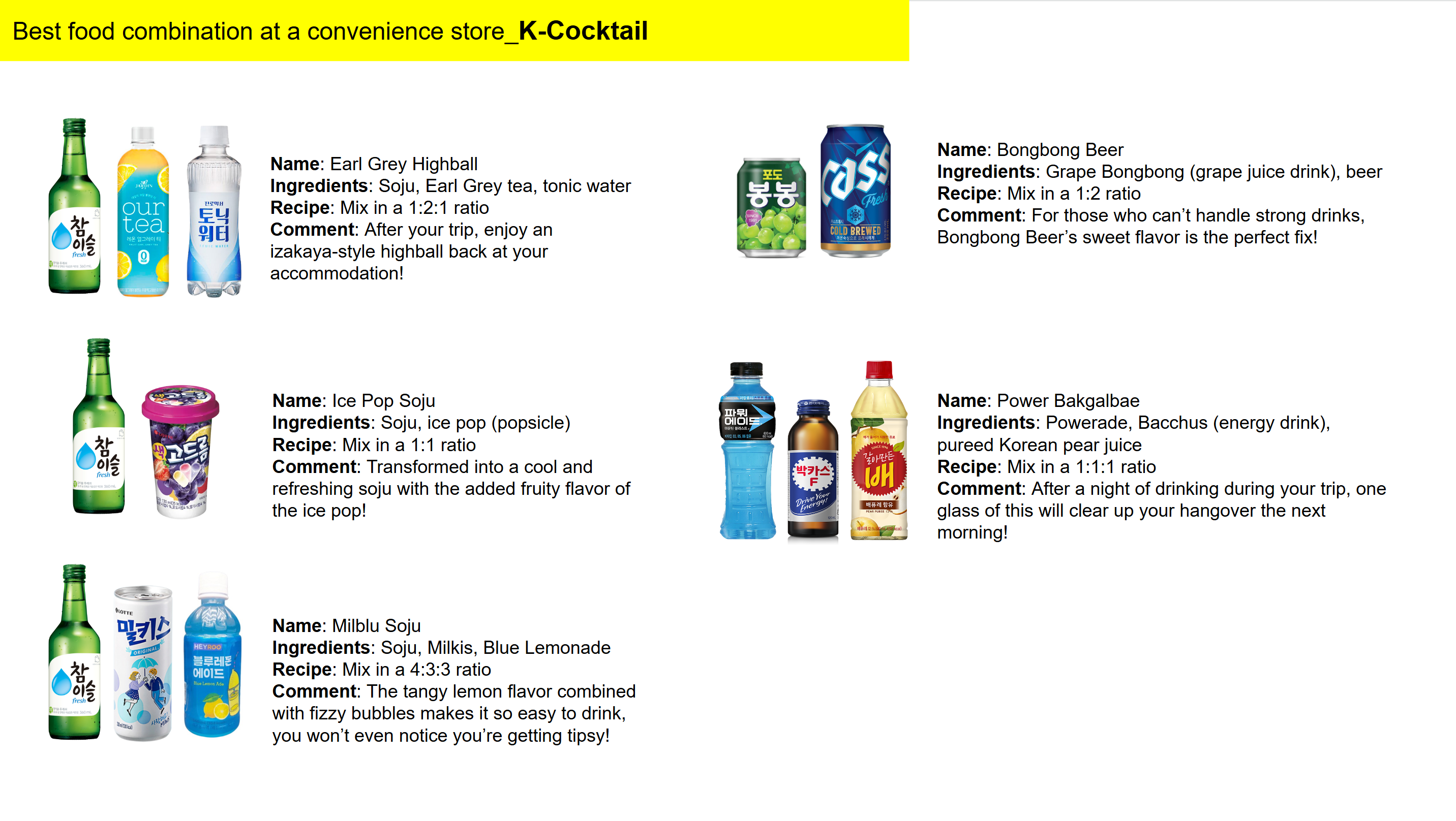Cocktail combos: Ice Pop Soju, Milblu Soju, Bongbong Beer, Power Bakgalbae