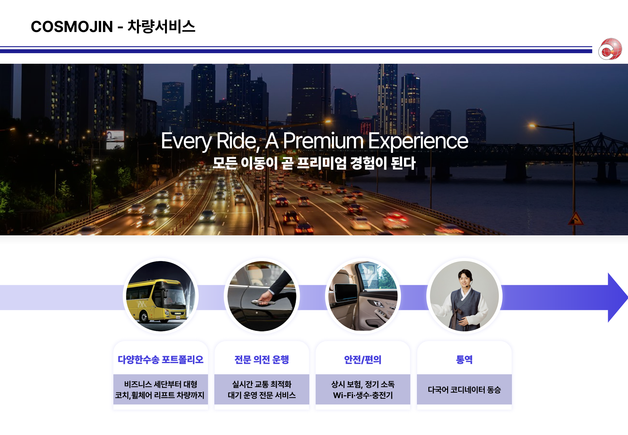 코스모진 차량 서비스는 단순한 이동이 아닌, 여정 전체의 품격과 효율을 높이는 경험입니다.