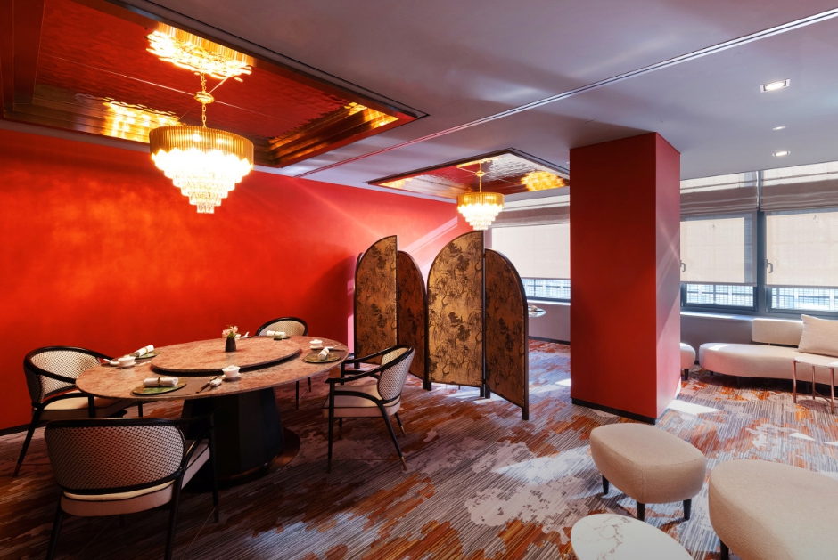 전통 한지 패턴, 은은한 조명, 한국 회화에서 영감을 받은 벽면 등이 어우러져 차분하면서도 정제된 분위기를 느낄 수 있습니다.