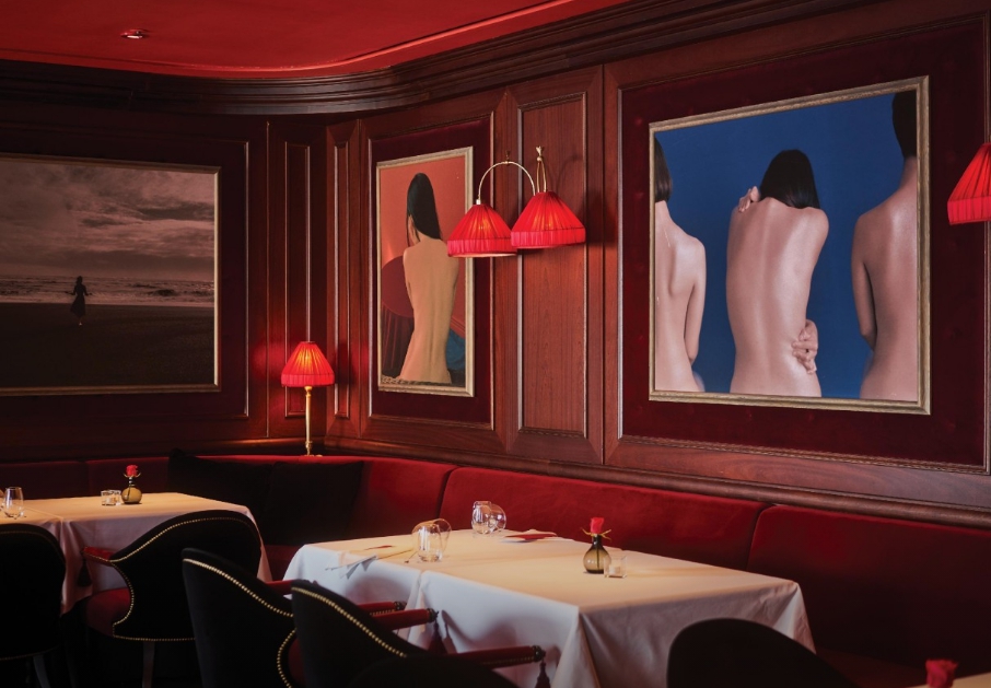 Its red-toned lighting, wooden textures, and large gallery-style artworks create a dramatic, “cinematic” dining atmosphere.